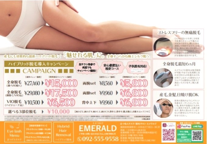 エメラルドのワキ脱毛は、1回分ずつの負担ですむ都度払い制が可能です。ワキのような濃い太い毛にも効果的なのでツルツルになれます。