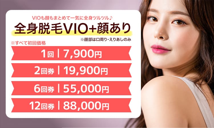 価格全身脱毛(顔・VIO含む)4回+スキンケア脱毛オプション総額100円*1