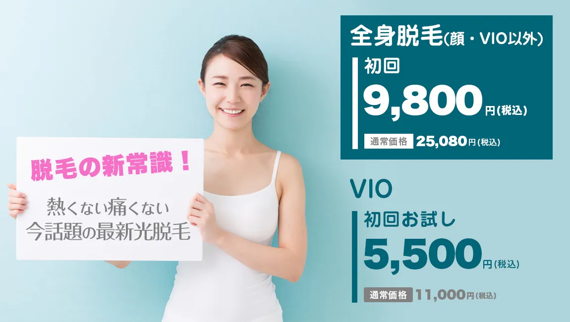 価格 | 全身脱毛(顔・VIO含む)4回+スキンケア脱毛オプション総額100円*1 |