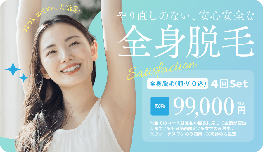 *1…84回分割、ボーナス払い併用の医療ローンでお支払いただいた場合のローン手数料込みのお値段になります。初回かつ当日契約の方限定、肌質、毛質によって照射できない場合がございます。
