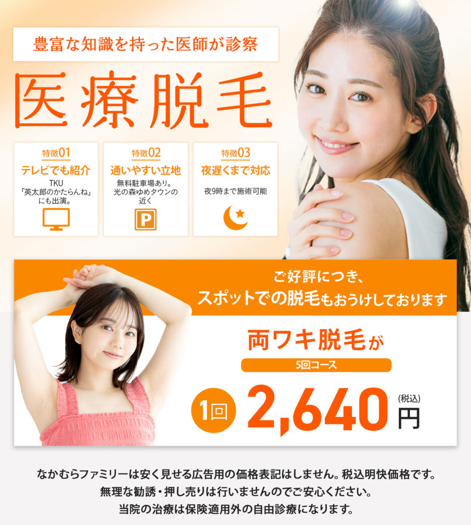 一般的に医療脱毛では、レーザーなどの機器を用いて発毛組織を破壊します。安全性が高い機器を熟練した医師が取り扱い、患者さんの肌や毛の状態に合わせた施術が行われても、施術後の肌はダメージを受けており、熱傷や炎症が起こりやすくなります。