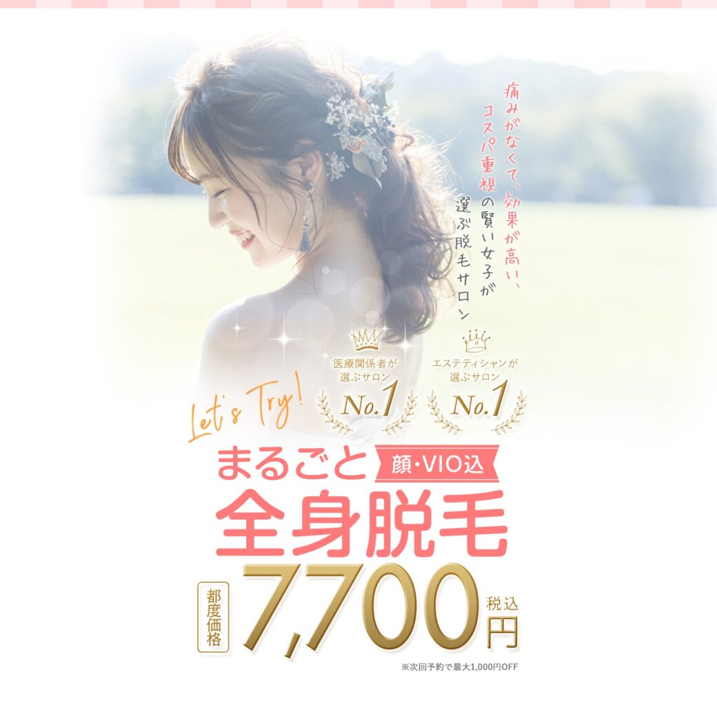 | 価格 | ・全身+VIO 5回 月々 1,200円*1 / 一括 69,300円 ・全身+VIO+顔 5回 月々 1,500円*1 / 一括 111,100円 |